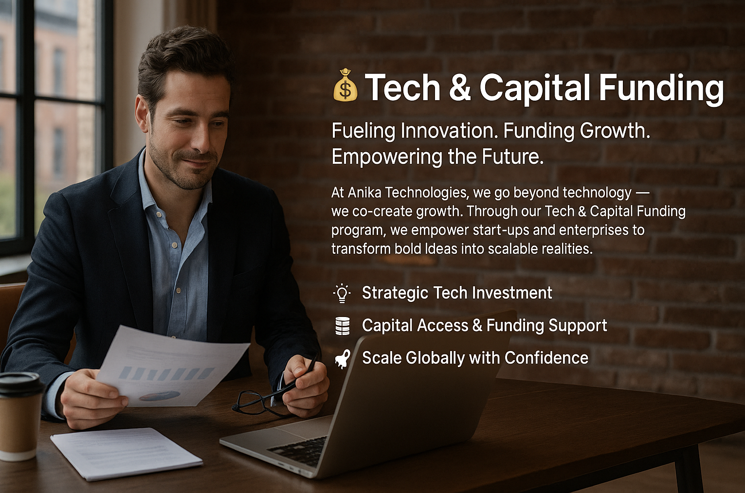 At Anika Technologies, we empower start-ups and enterprises with strategic tech funding and capital support. By combining equity partnerships, revenue-share models, and technology investment, we help businesses access growth capital, accelerate innovation, and scale globally with confidence.