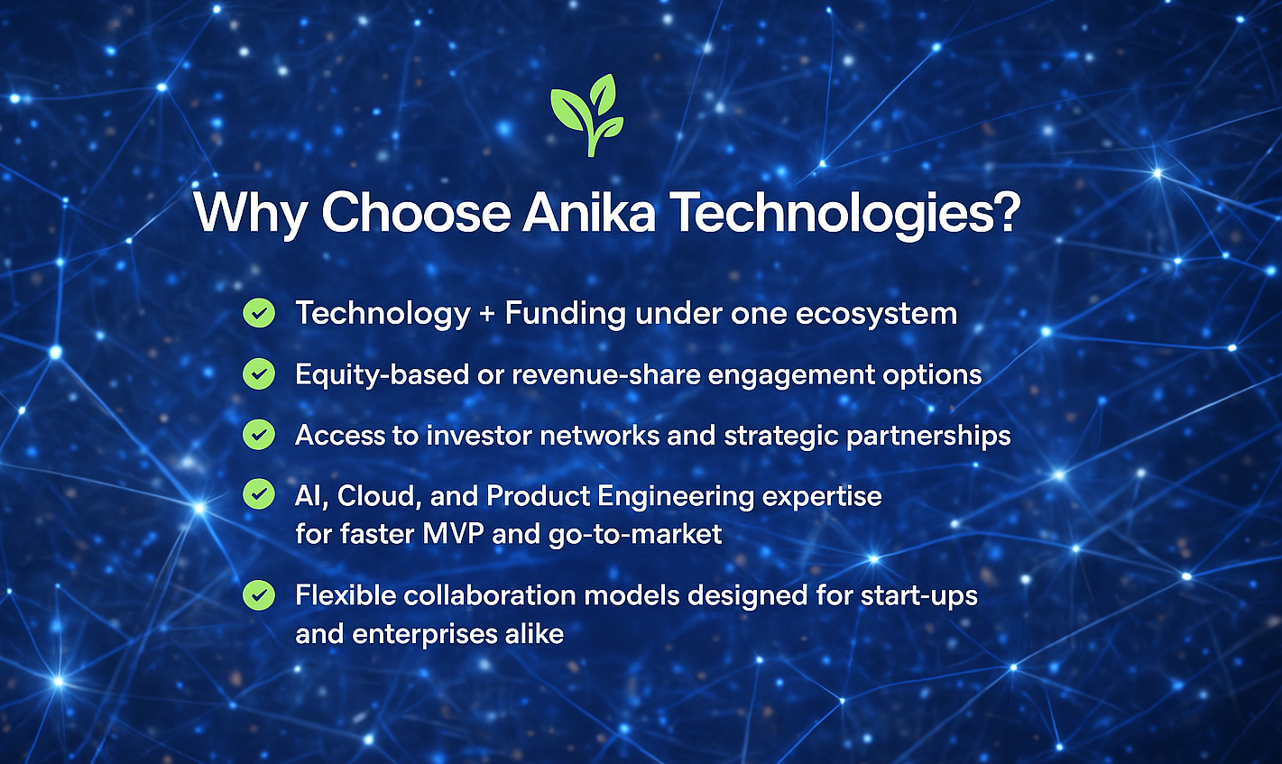 At Anika Technologies, we go beyond technology — we co-create growth. Through our Tech & Capital Funding program, we empower start-ups and enterprises to transform bold ideas into scalable realities.